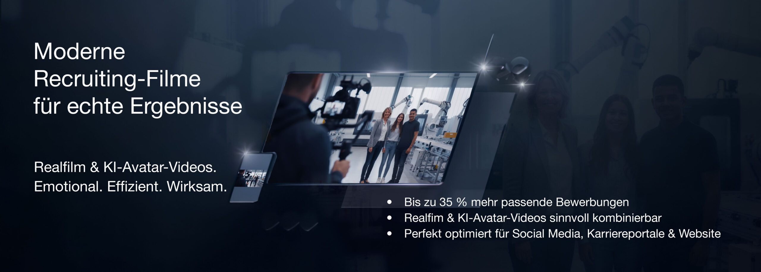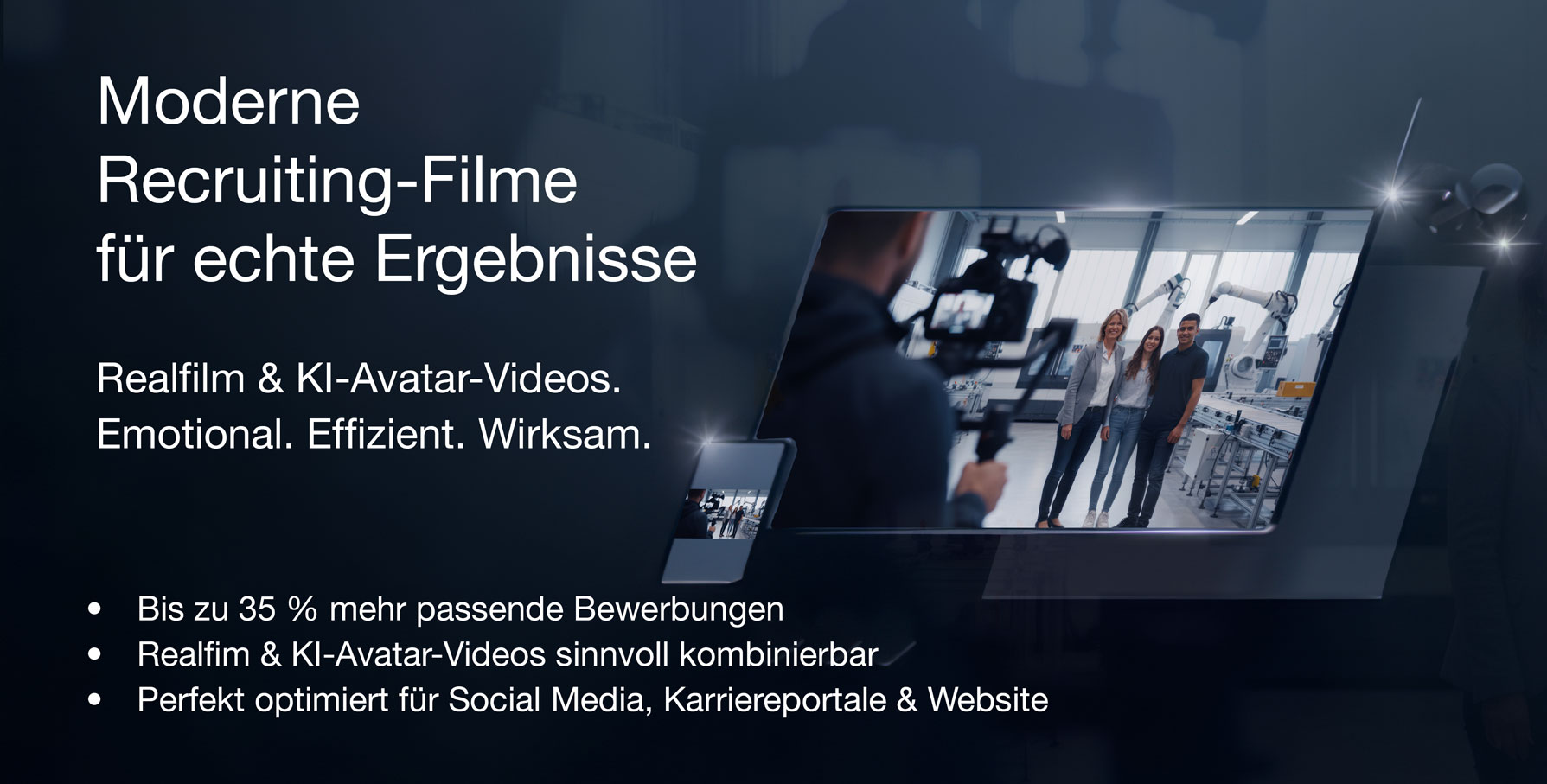 Wir setzen zusätzlich auf moderne KI-Technologien, z.B. mit KI-Off-Sprechern und – für spezielle Einsätze – KI-Avataren. Diese verstehen wir als ergänzende Option, die Ihre Recruiting-Strategie innovativ erweitert (AVACRUIT®).
