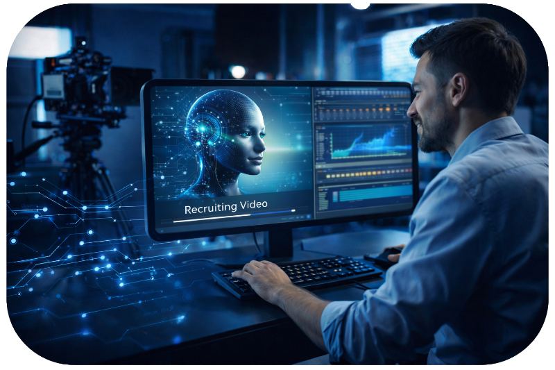 Recruiting-Filme für Berufserfahrene setzen wir mit AVACRUIT® um. Dabei nutzen wir klar strukturierte Inhalte und auf Wunsch moderne KI-Technologien wie KI-Off-Sprecher oder KI-Avatare. Diese Formate machen Recruiting-Prozesse effizienter, vergleichbarer und besser planbar.